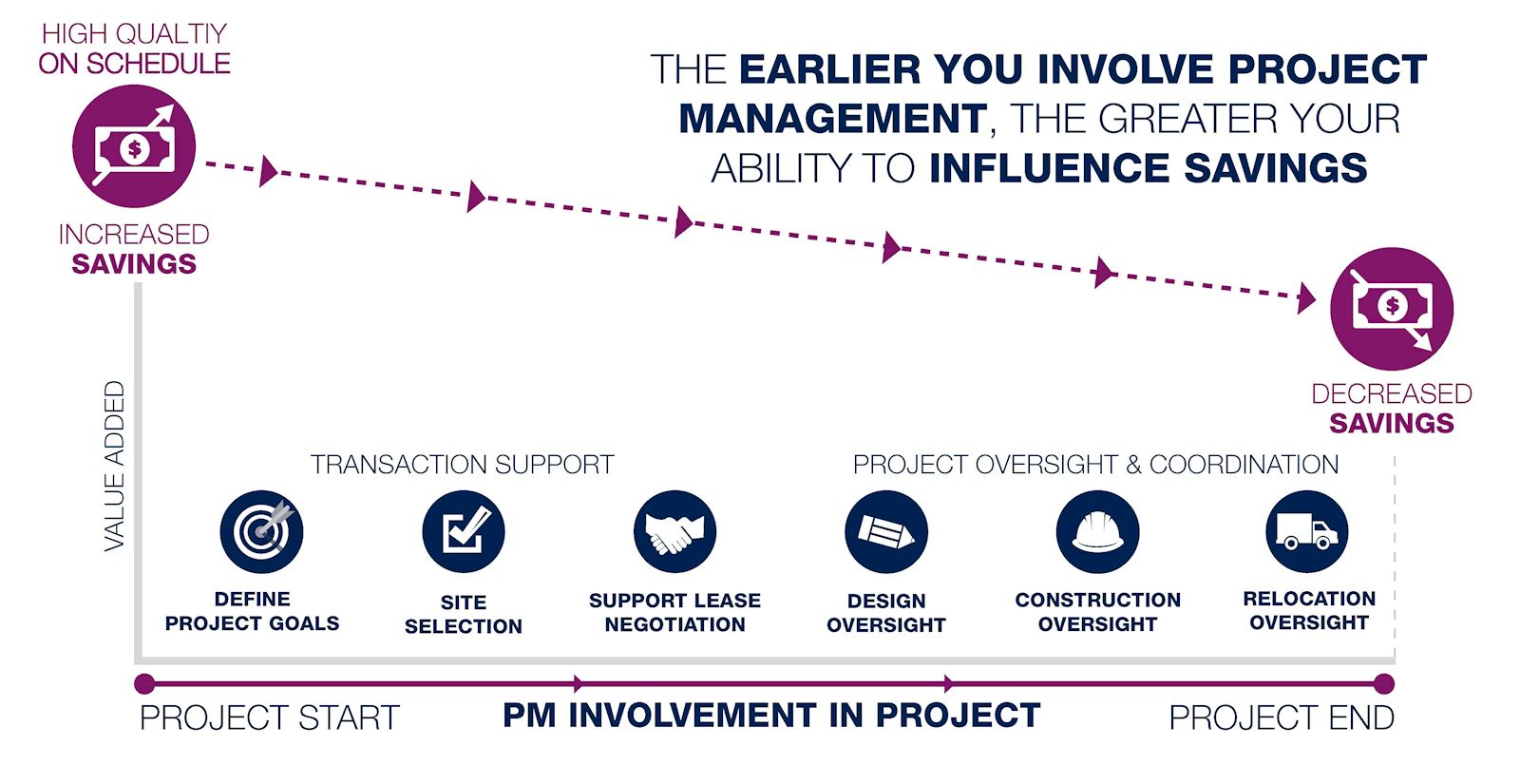 Project managers bring expertise to many facets of a construction project and are ultimately responsible for the success or failure of the project, and more importantly, the tenant’s satisfaction. A skillful project manager plans, organizes, and oversees all aspects of a project. A project manager must have exceptional communication and planning skills, be detail oriented, have an ability to tactfully influence positive decision making, and possess the ability to hold key stakeholders accountable. Managing a real estate project takes a great deal of coordination and time to ensure a successful outcome. Projects are a series of inter-dependent tasks and even the smallest actions can have broad implications for the project. So why involve a project manager in these essential tasks at the start of a project?