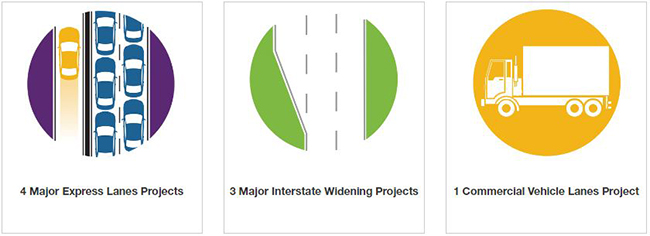 I-285 express lanes. Provides travel options and more reliable trip times by adding two new express lanes in each direction across the top end of I-285. Adds 53 new lane miles in metro-Atlanta. Start date: 2023.