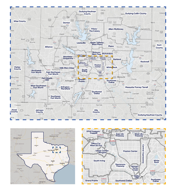 The Dallas / Fort Worth quarterly Office Market Report details Class A & B stats across each submarket in the metroplex as well as DFW as a whole.